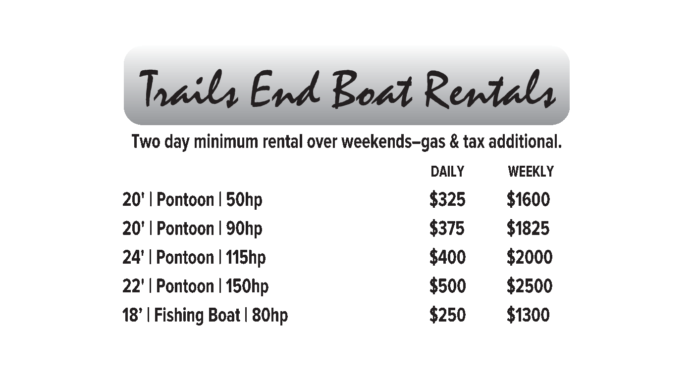 Boat Rentals We have pontoon rentals available for you to get out and enjoy the lake. Click here for current boat rental rates